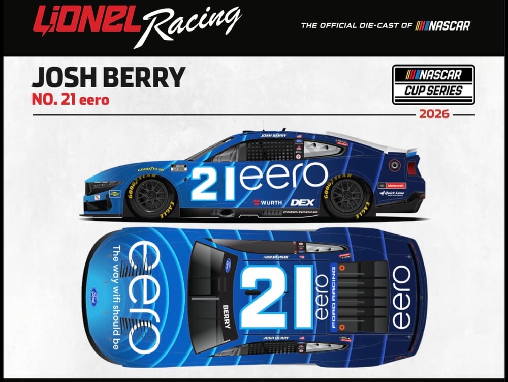 Lionel Racing - the Official Die-cast of NASCAR® - is excited to offer Berry’s fans the 2026 No. 21 eero Ford Mustang for order. Produced on Lionel Racing’s Mustang Dark Horse
